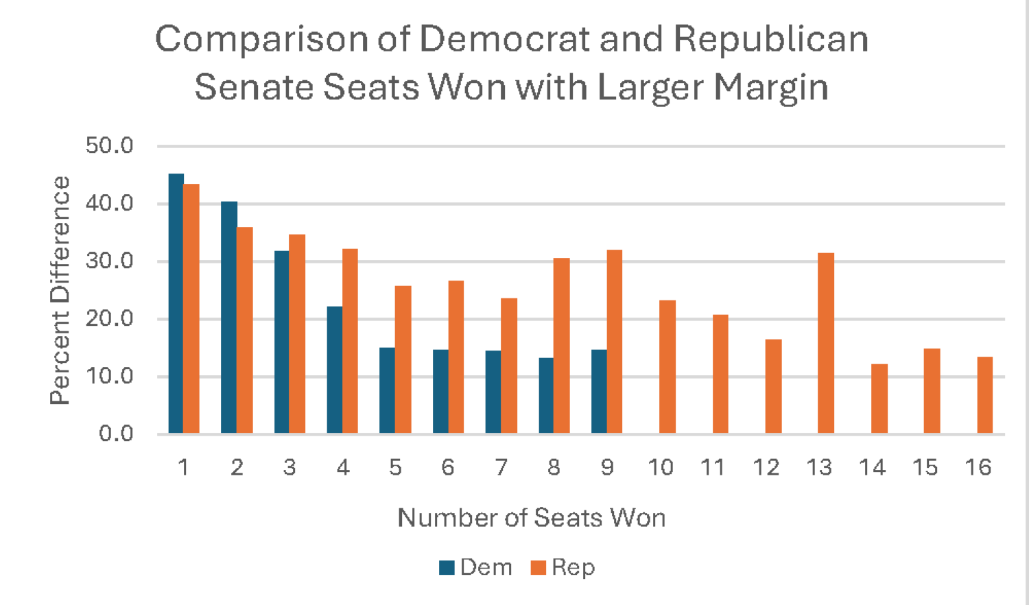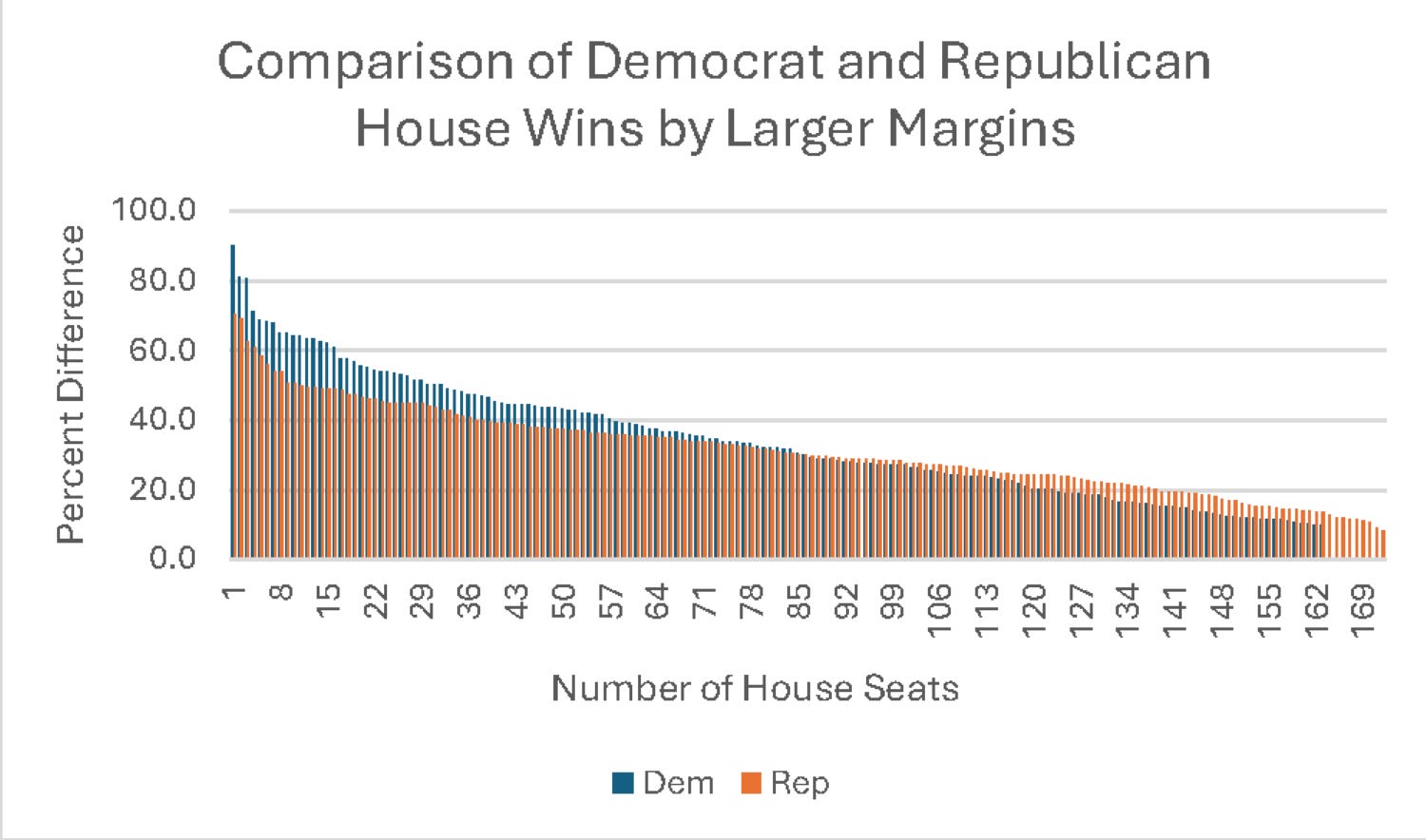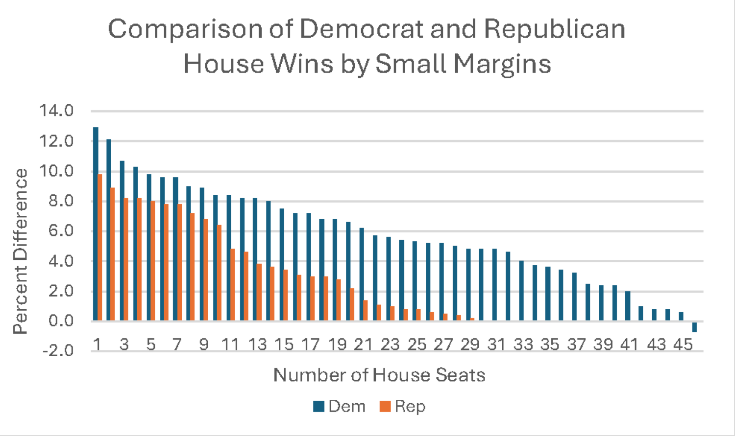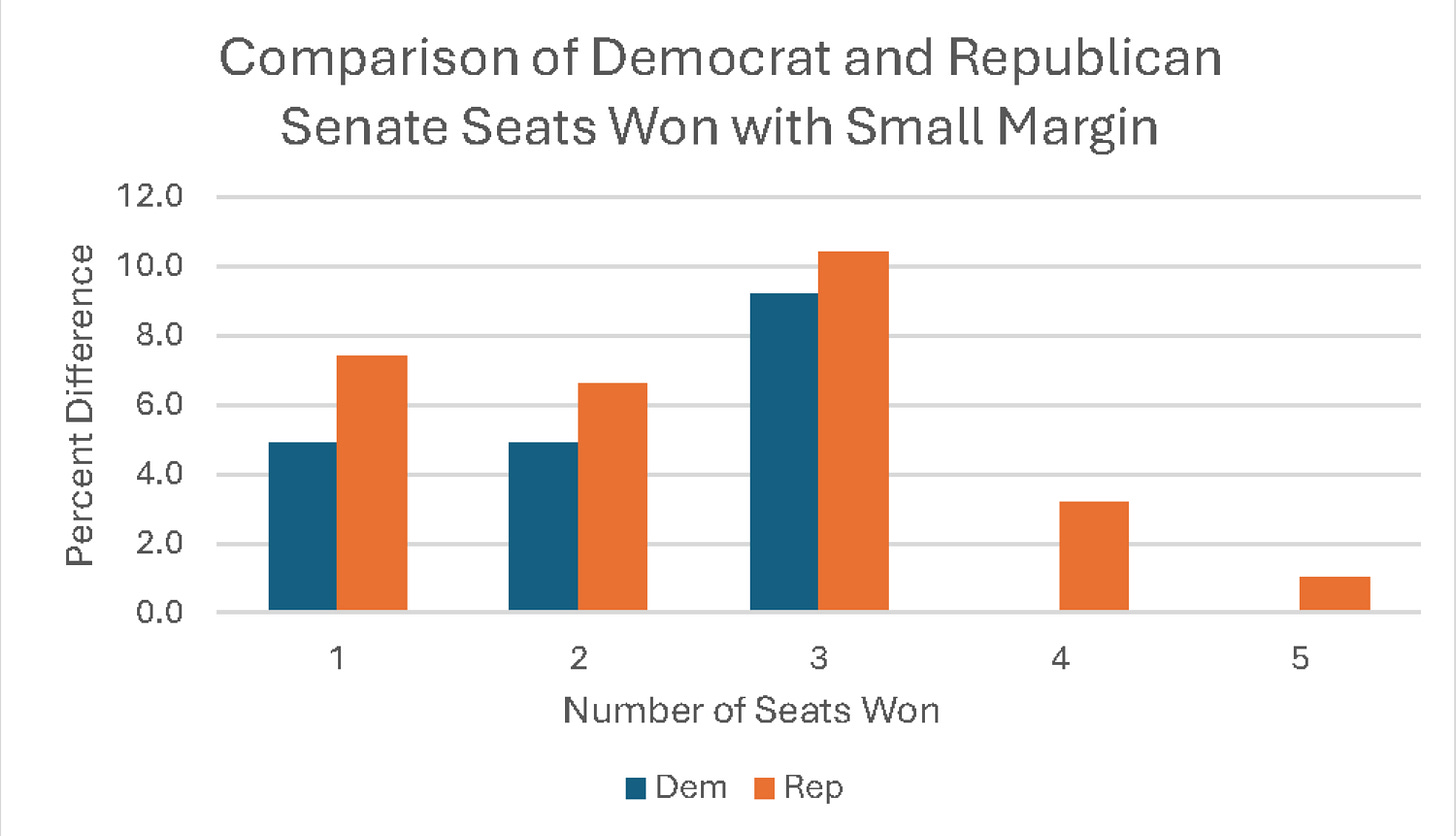 The table for small margins looks only at races where the winning/losing percentages vary from 45.1 to 54.9 percent. If you look at the table for the House of Representatives races with small differences, you will find that Democrats won almost twice as many close races as Republicans. You will also see that the winning percents are remarkably similar, and that the curve is very smooth.