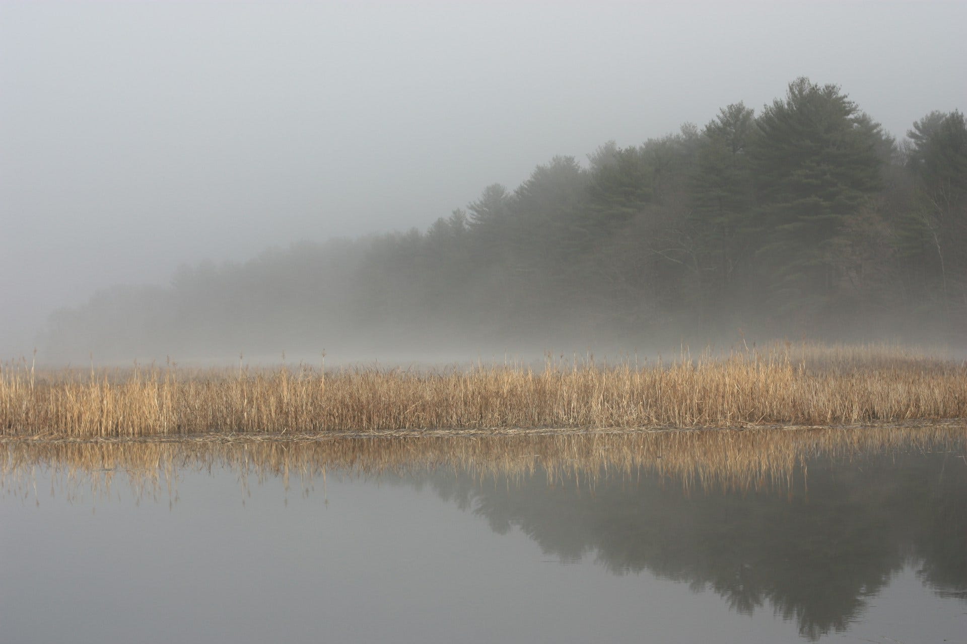 Hidden by the mist, a red-winged blackbird calls. From across the marsh comes an answering call.
