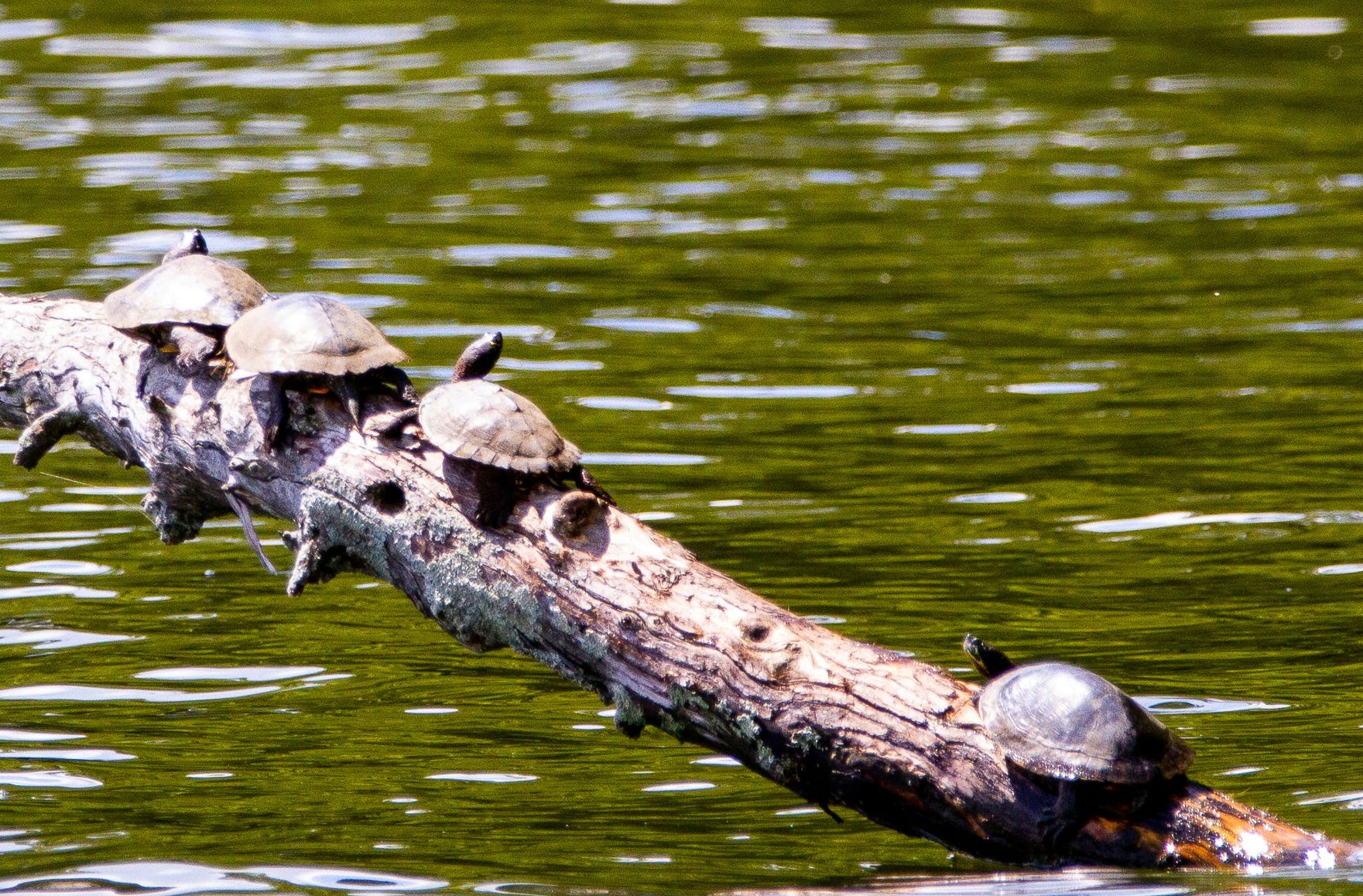 Turtles climb from the water. Oakley watches them march along a log, then settle to bask in the sun.